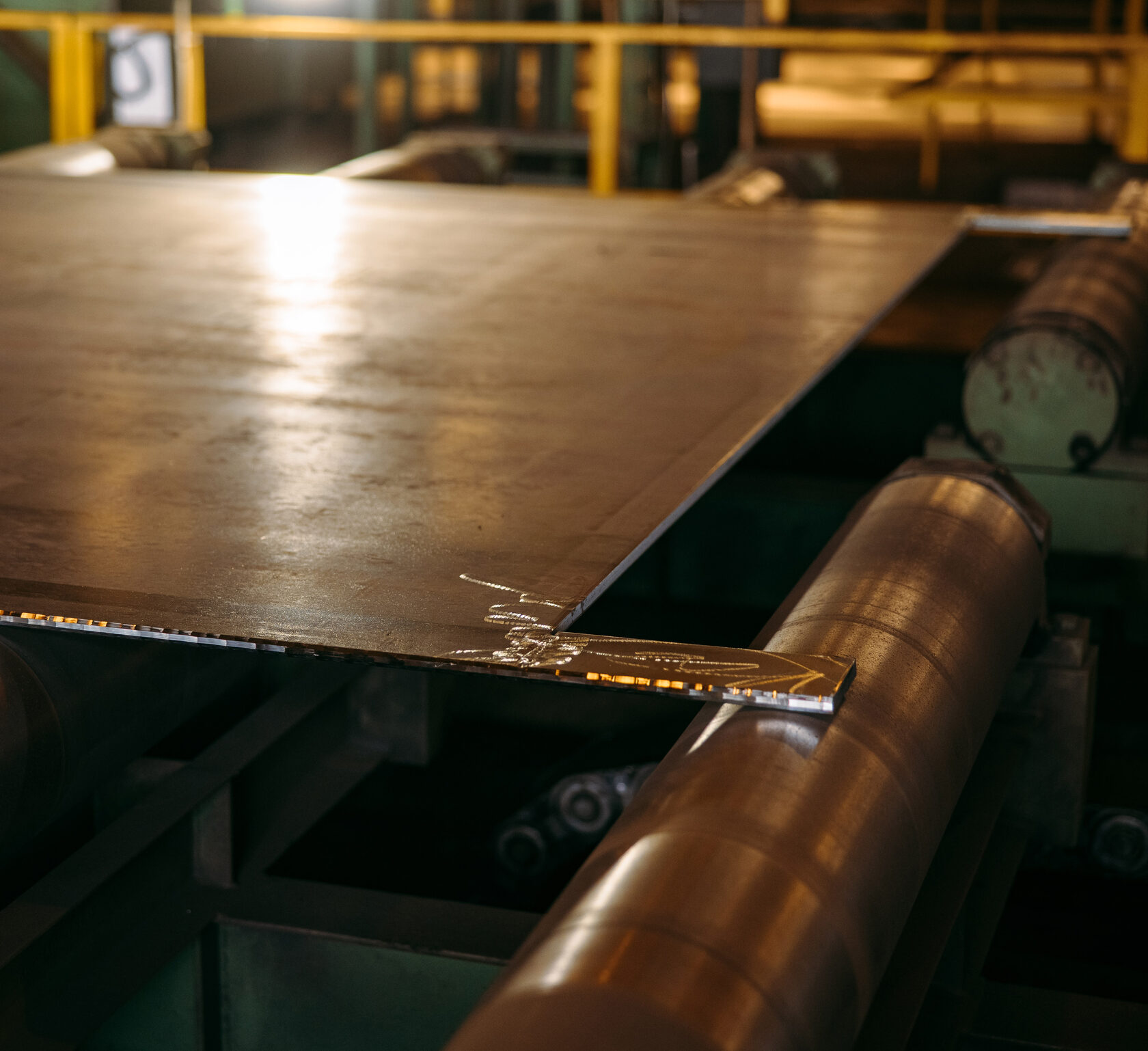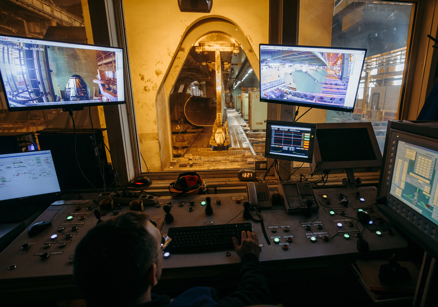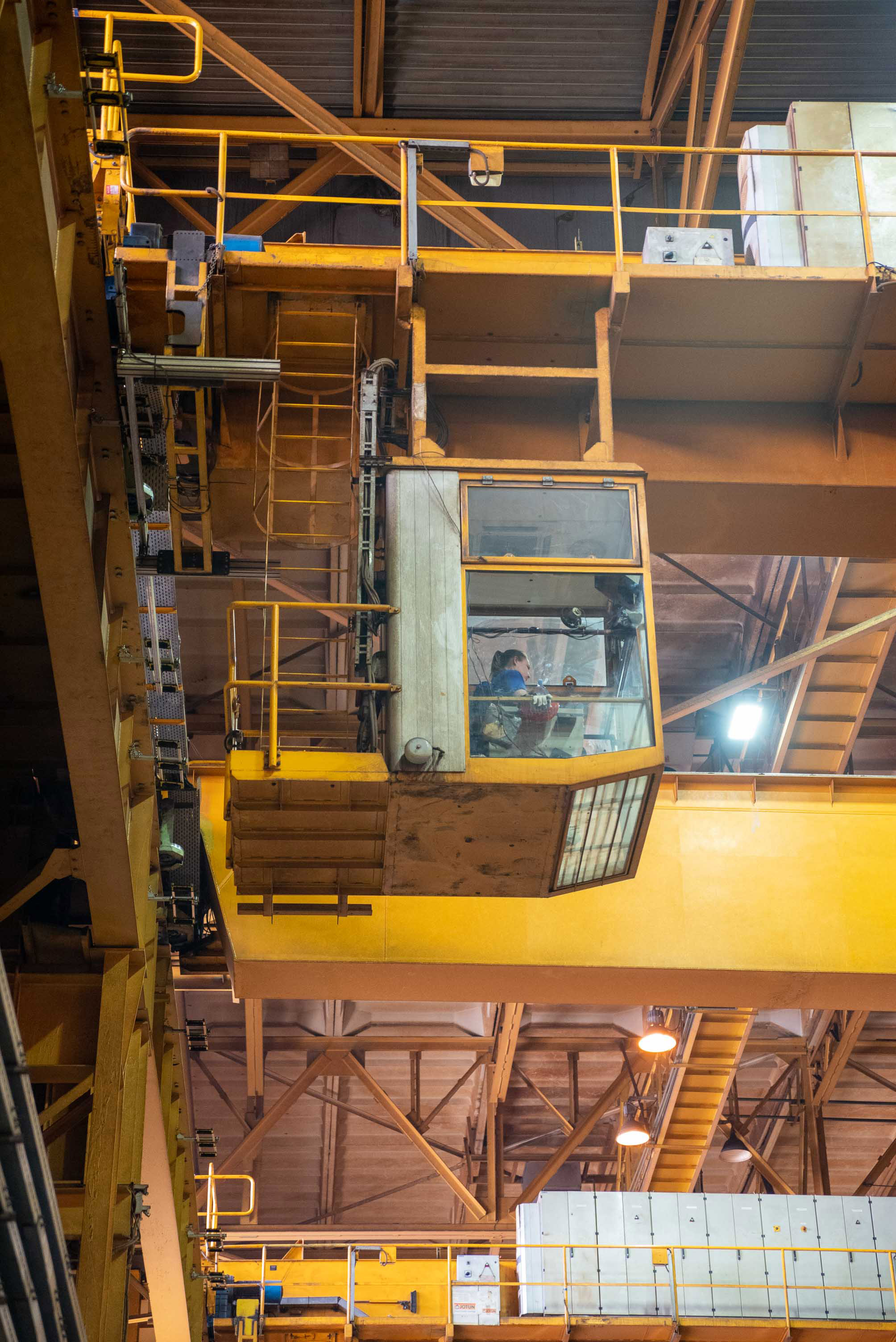 В конце цеха находится временный склад, куда доставляют готовые листы. Помещение огромное: высокие стены, стопки листов металла и краны, скользящие под самым потолком. В небольшой кабинке наверху сидит машинист крана, на этом рабочем месте часто трудятся девушки. Магнит медленно опускается